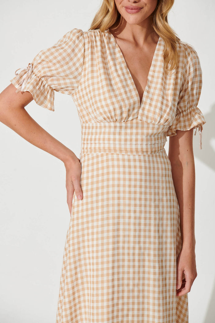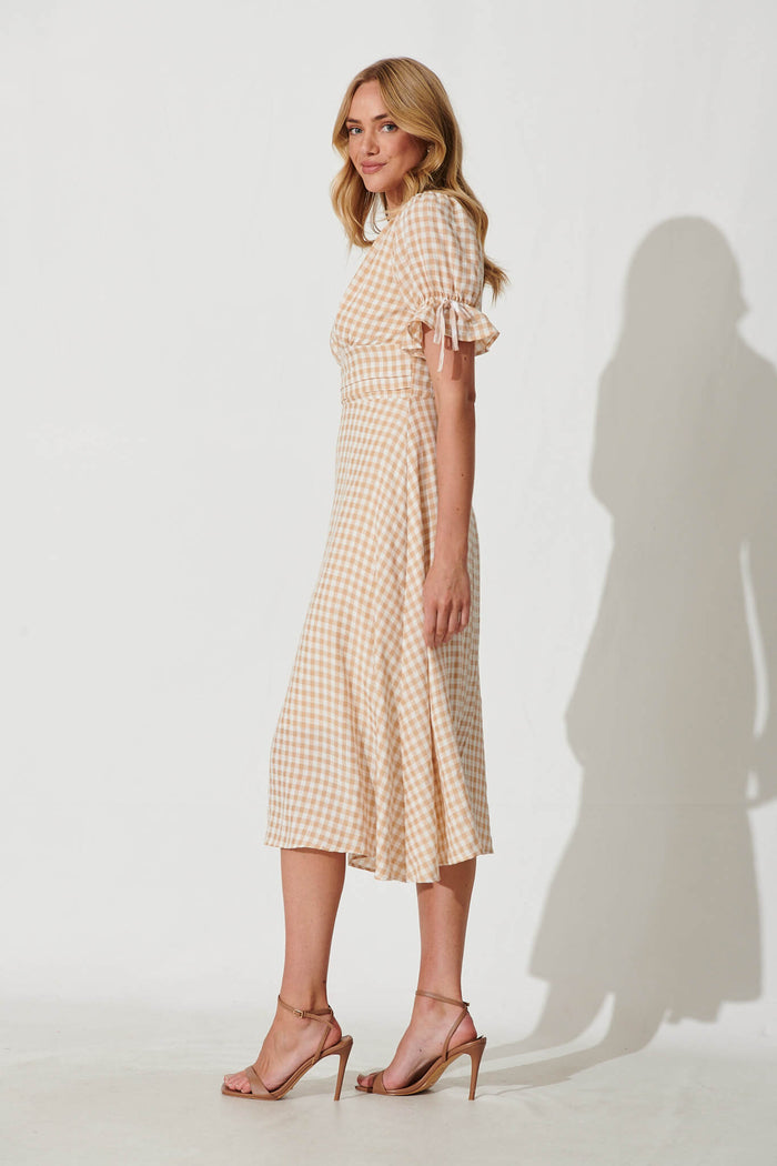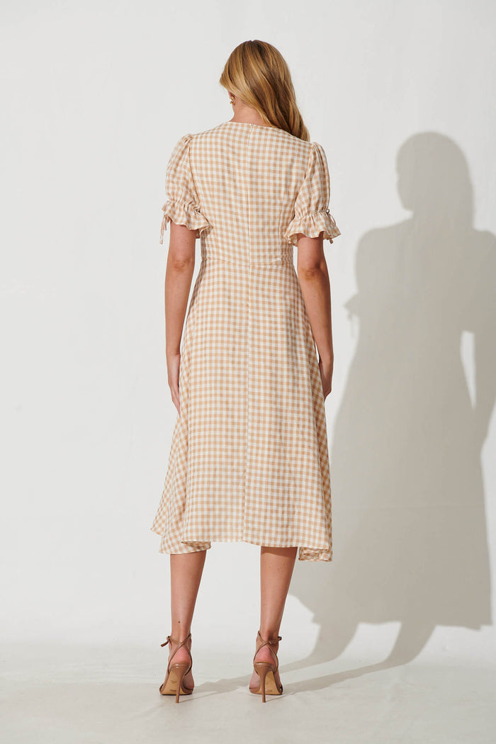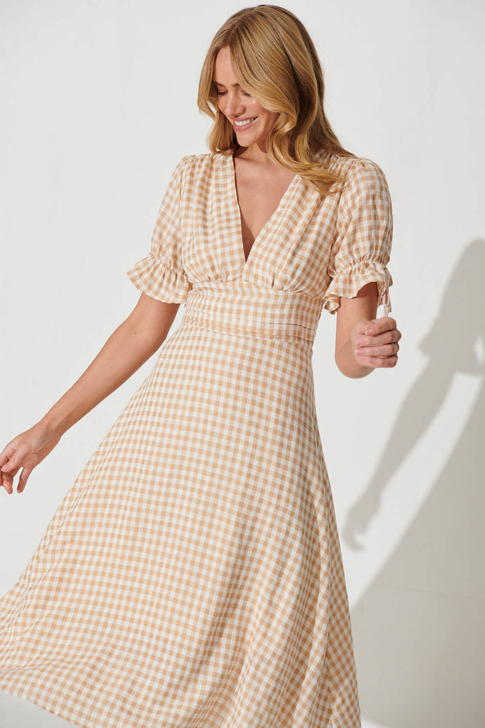 Sunrays Midi Dress In Beige Gingham Check Cotton Blend