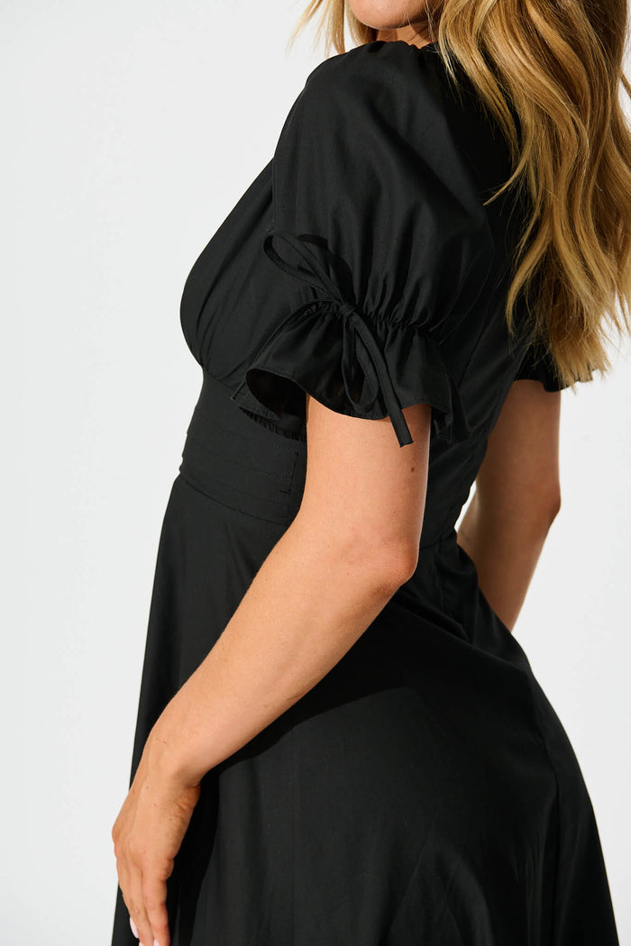 Make a statement in our Sunrays Midi Dress this season. Made from a cotton blend fabric, featuring a unique tie up sleeve with a pintuck waistline.
