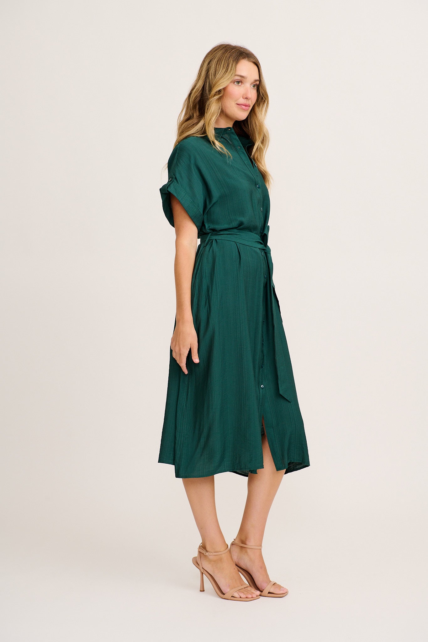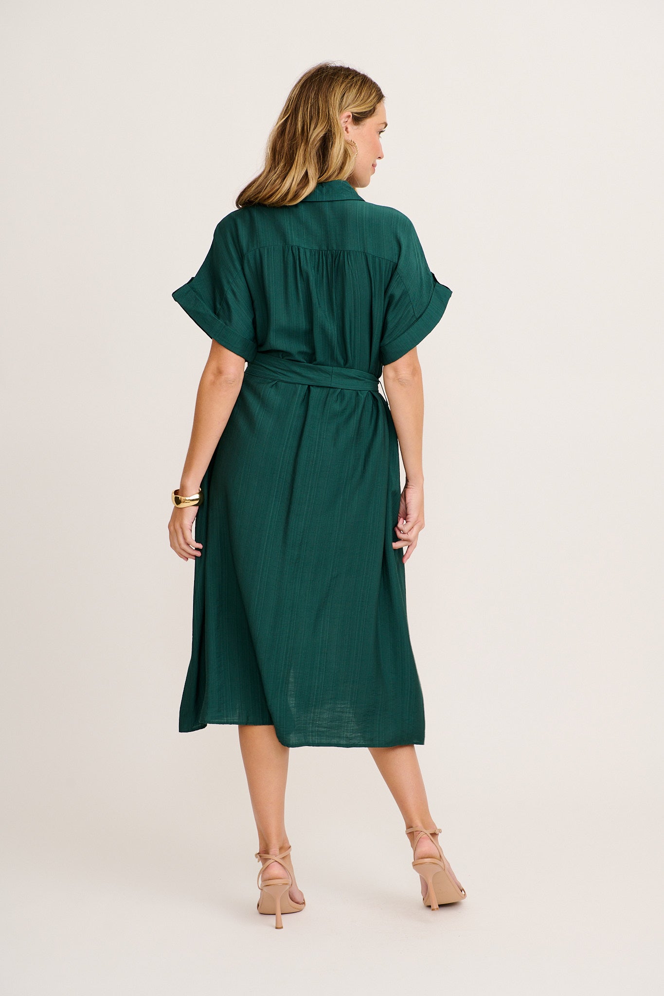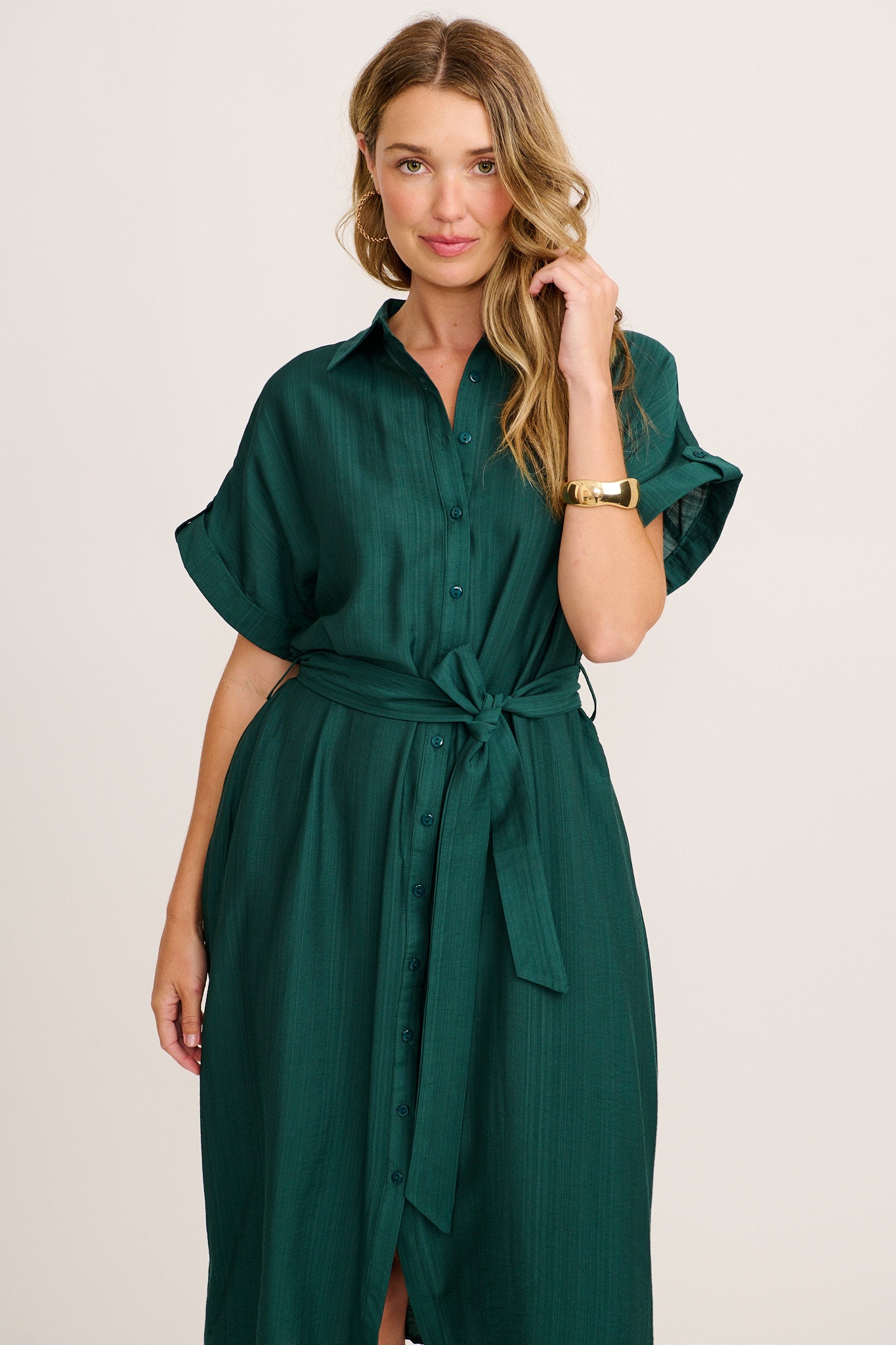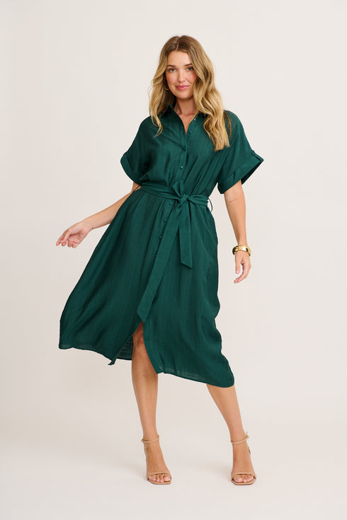 Step into effortless elegance with the Sweet Talk Midi Shirt Dress in Emerald — a refined wardrobe essential that transitions beautifully from workdays to weekend escapes. With its rich, verdant hue and thoughtful design details, this dress feels both polished and easy‑going, perfect for warm weather or layered looks as the seasons shift.