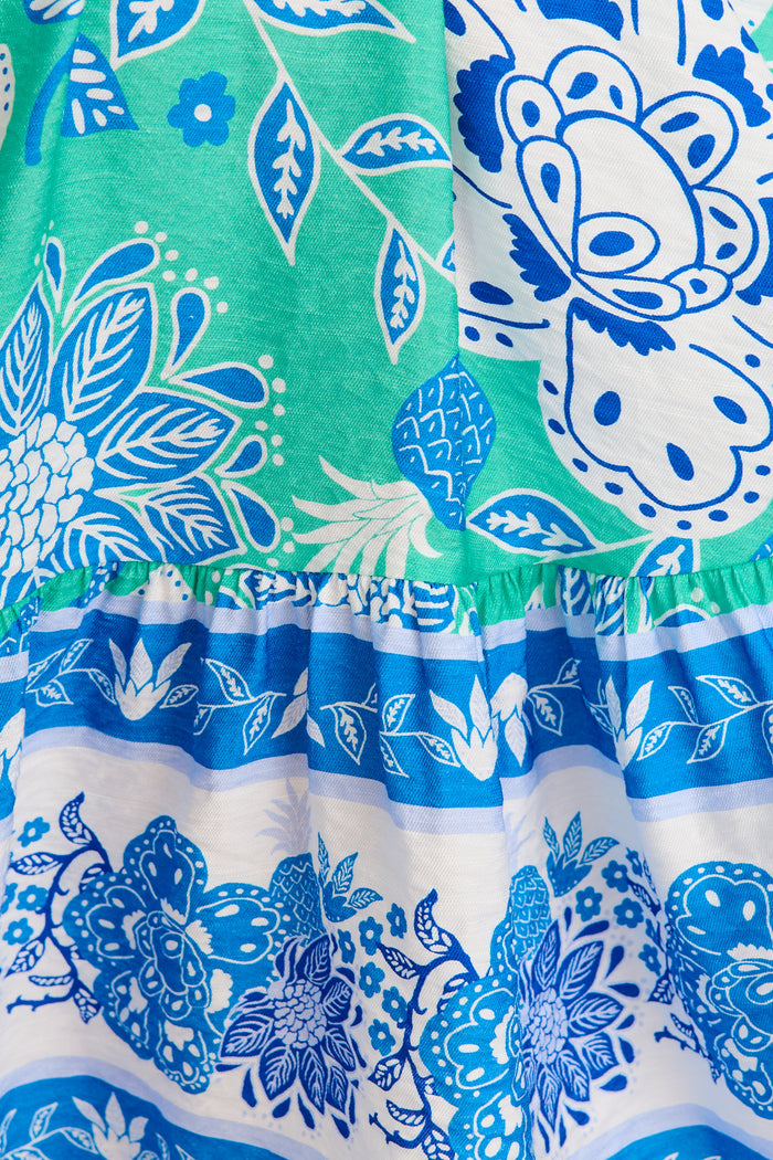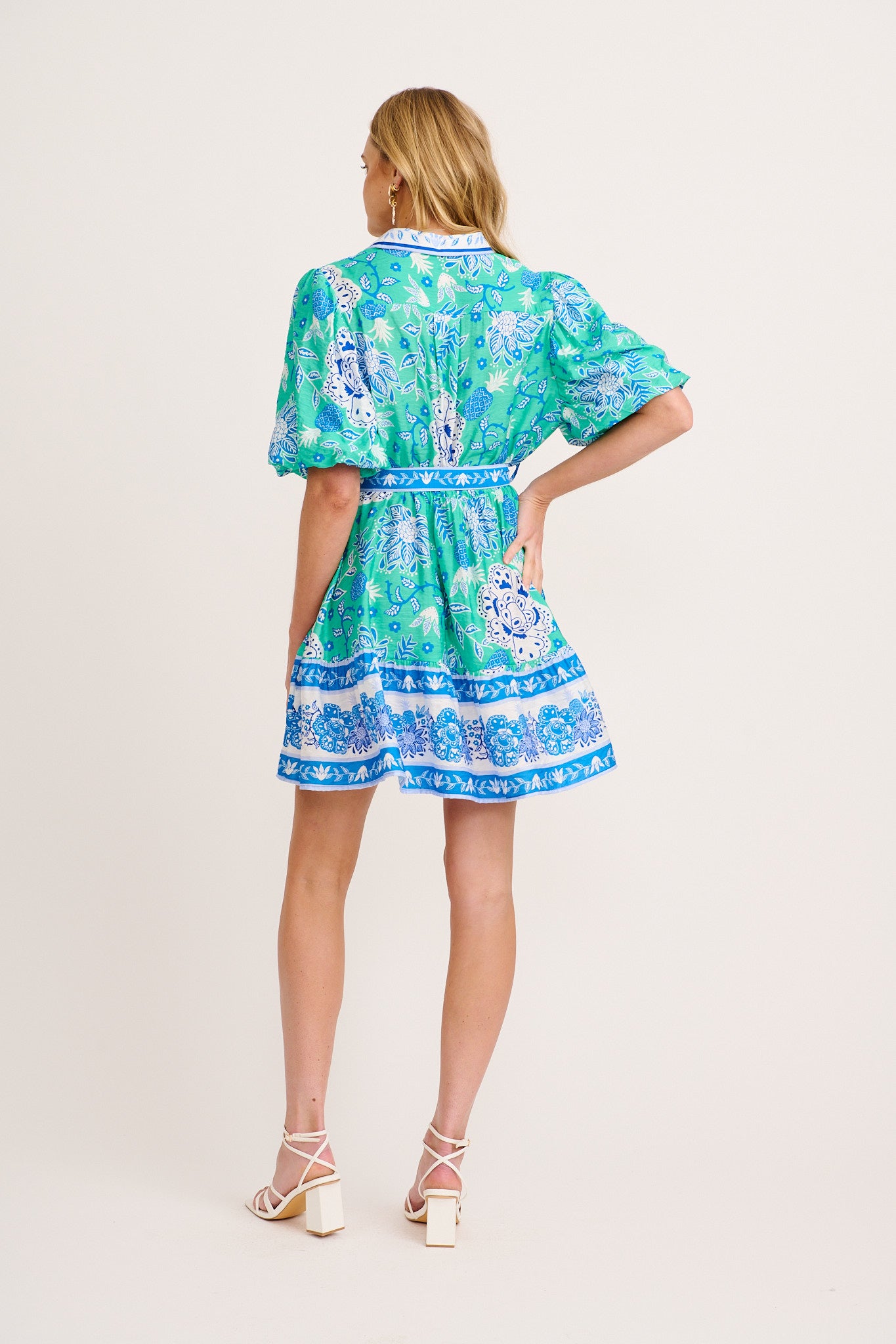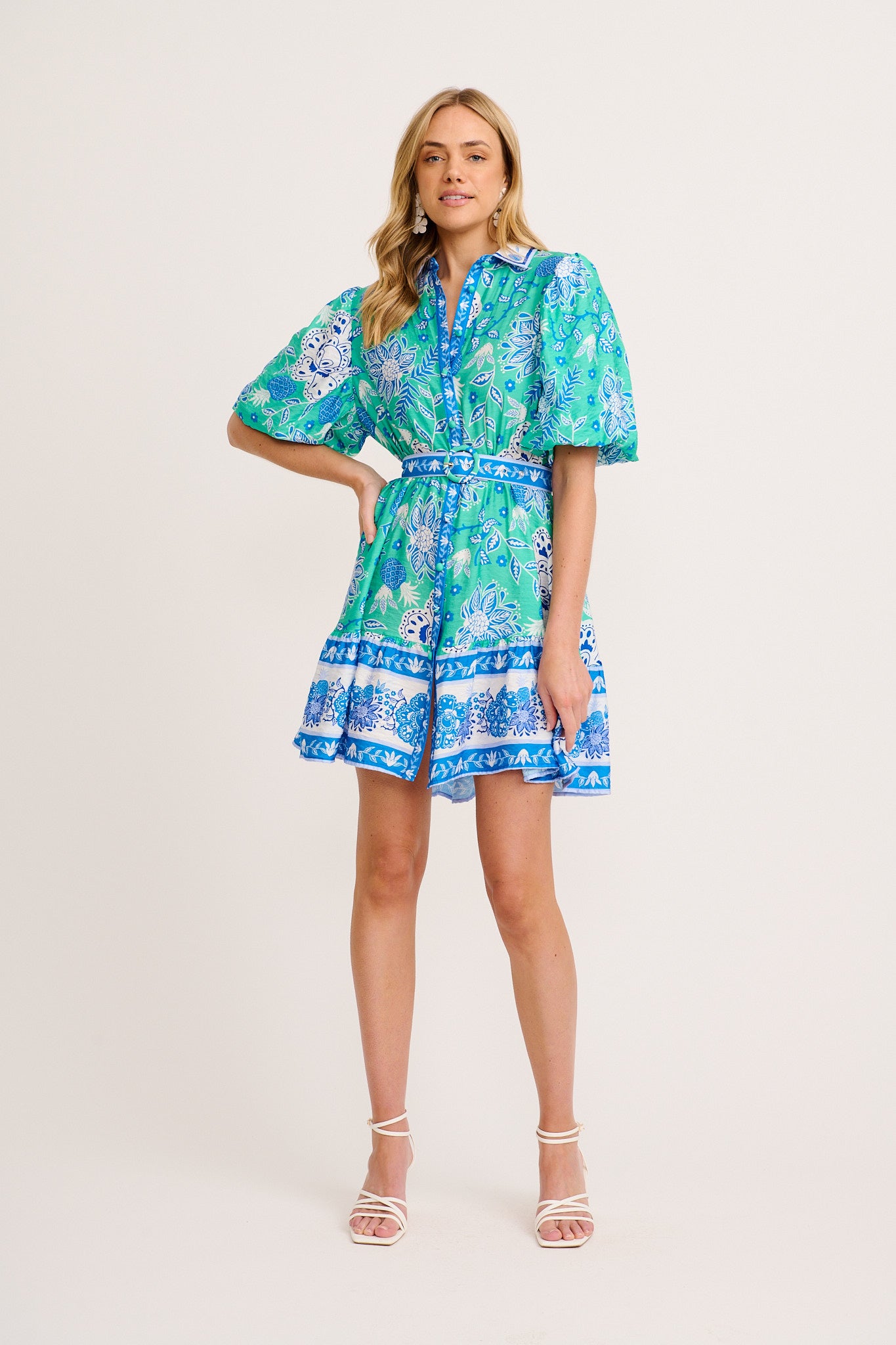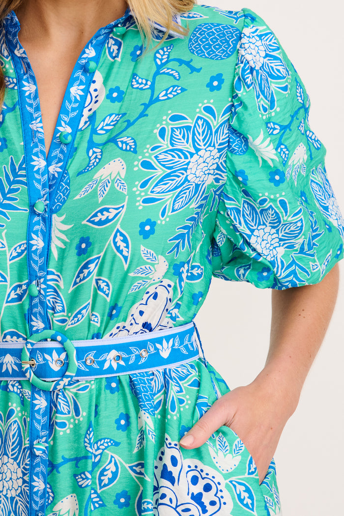 Tainy Shirt Dress in Green with Blue Floral Linen Blend