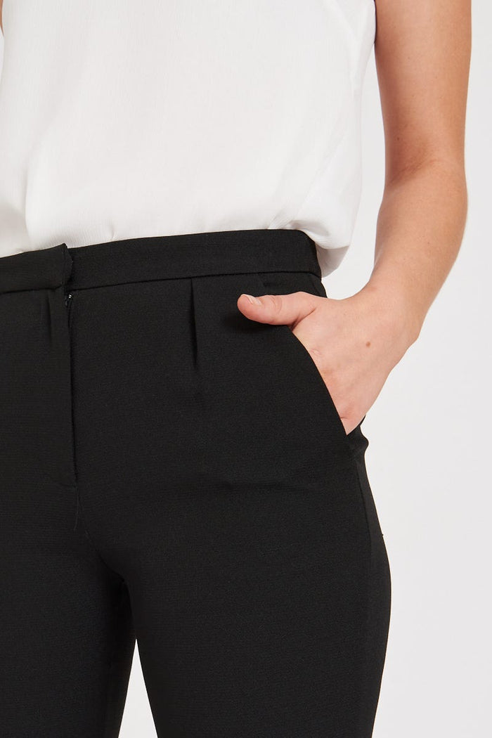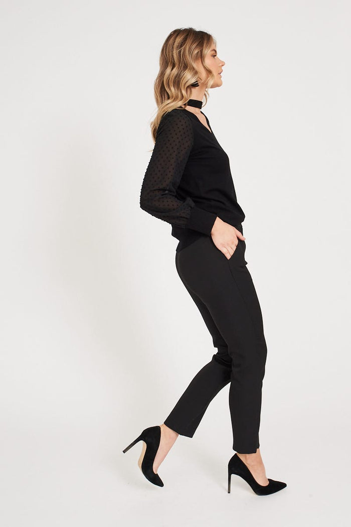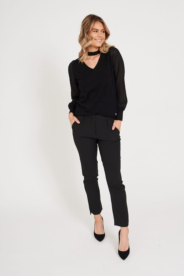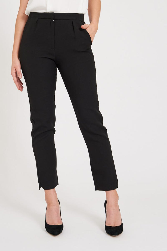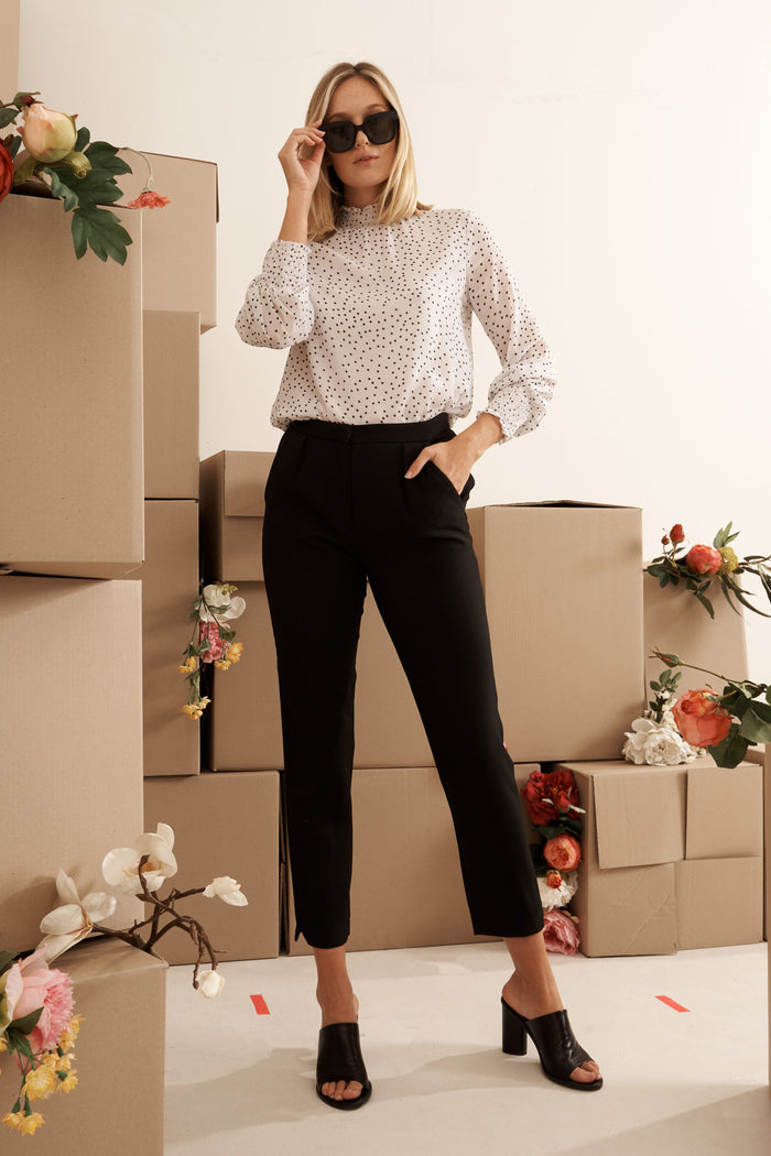 The Tally Tapered Pants in Black will take you from desk to dinner with ease. This mid rise, ankle length style feature pockets and pleating at the waist. Pair yours with a chunky knit.
