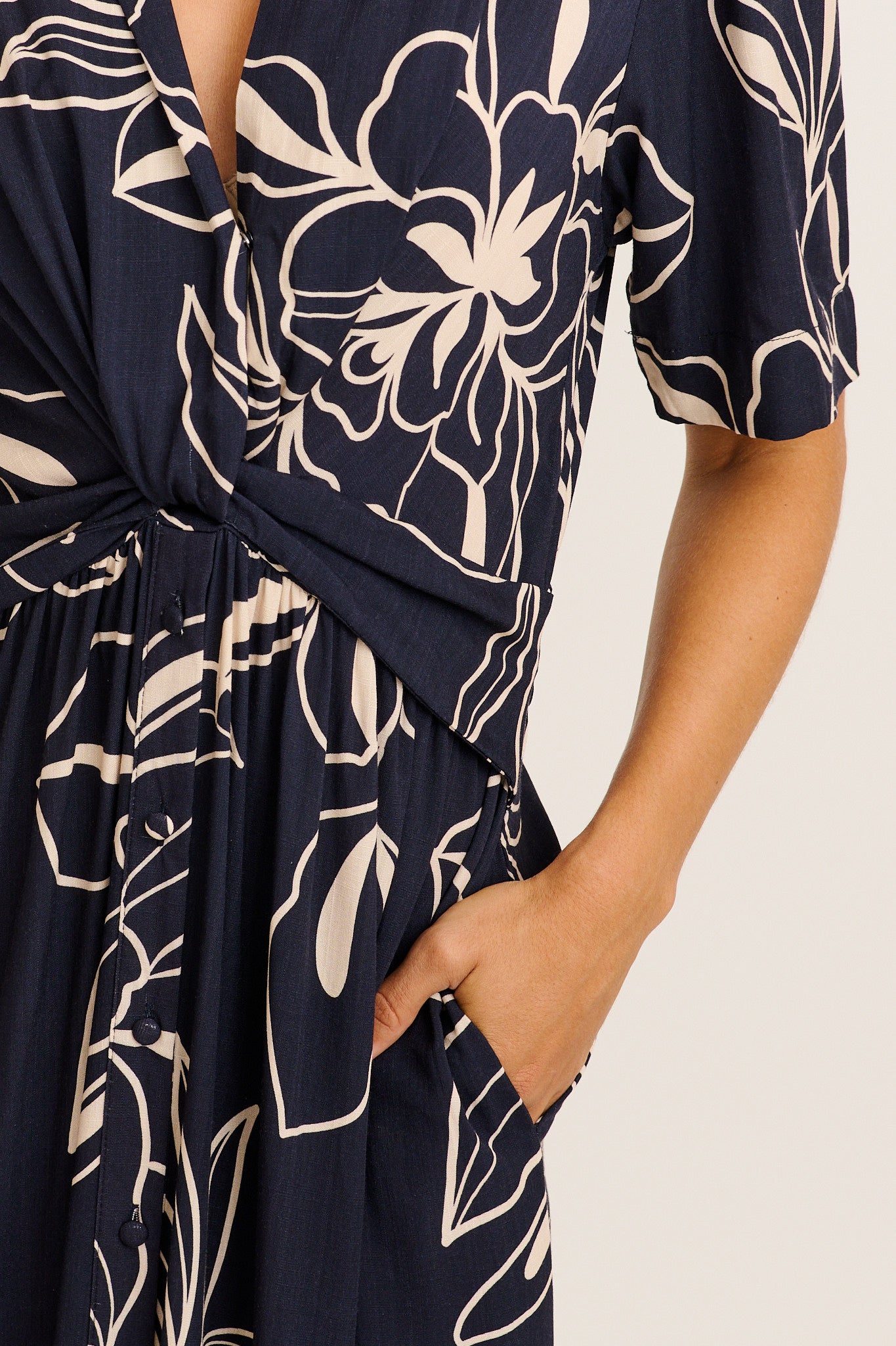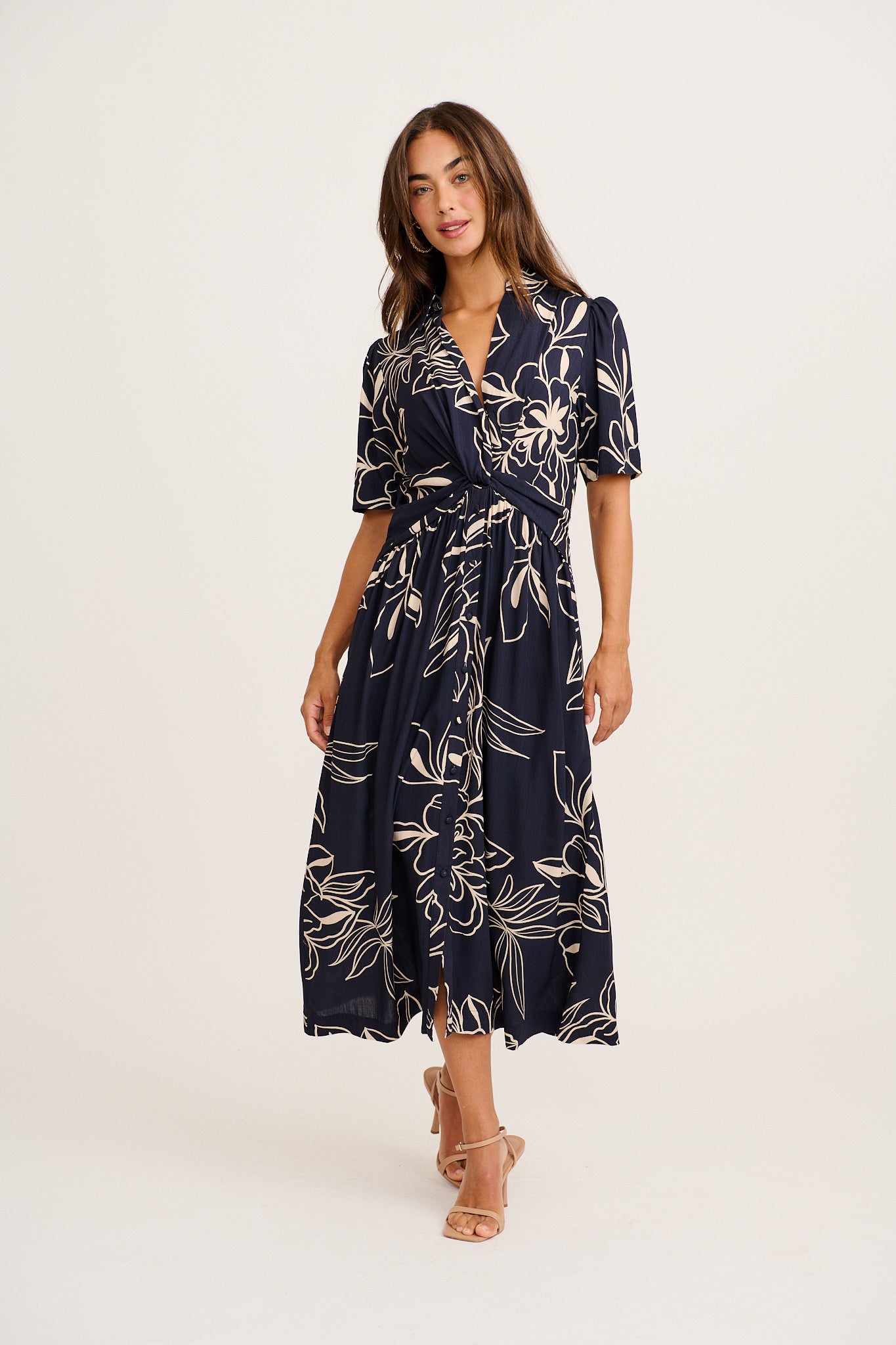 A collared V neckline with snap button fastening creates a refined finish, while the twist front detail enhances shape through the bodice. Functional dome buttons through the lower skirt add practicality, and side pockets bring everyday ease. Designed with an elasticised waist and flowing midi length, it’s a versatile piece for workdays, weekends, and beyond.