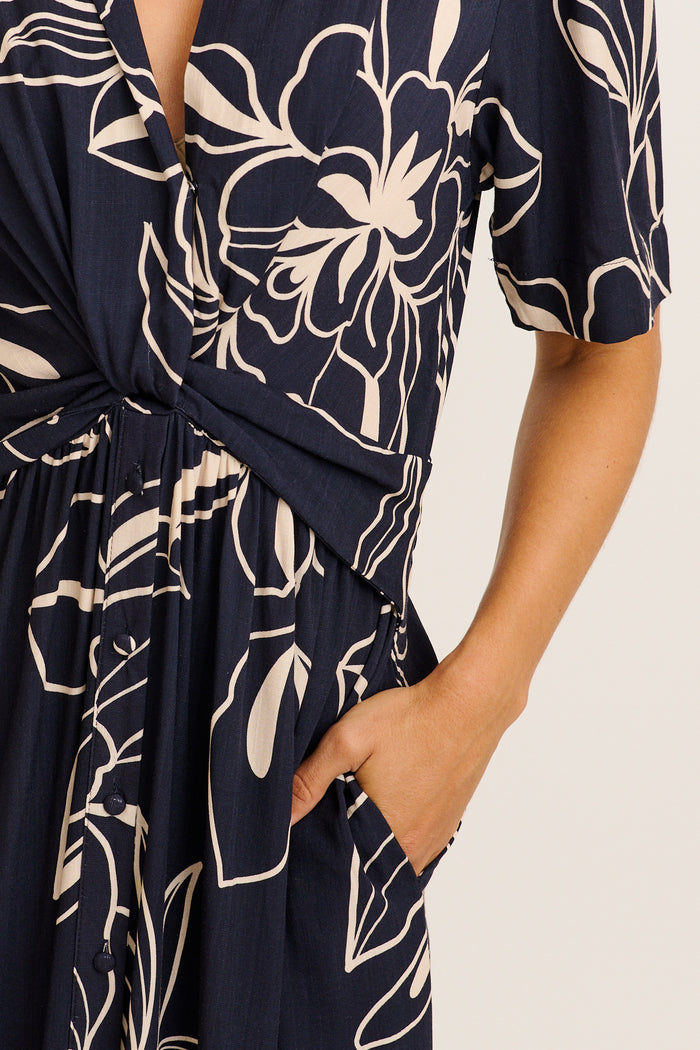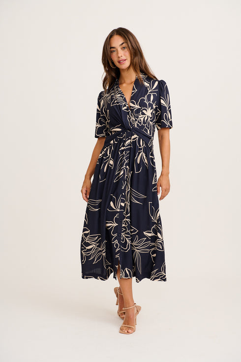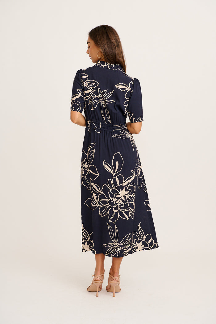 Tamika Midi Dress in Navy with Cream Sketch Floral
