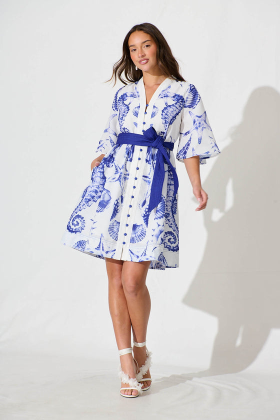Tandie Midi Dress In White With Blue Print Linen Blend
