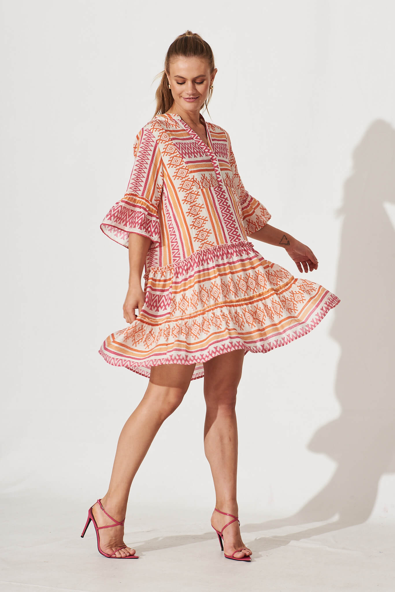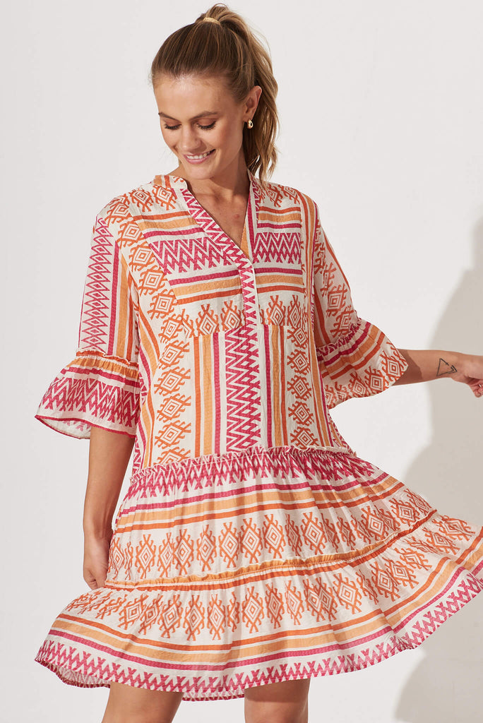 Tesoro Smock Dress In Pink And Orange Aztec Print