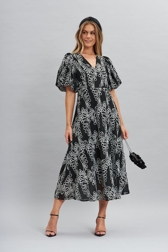 Introducing our Tiffany Maxi Dress. Featuring soft detailed embroidery all over, v-neckline, & figure flattering silhouette framed by voluminous puff sleeves. The perfect piece for dressy day to night occasions. Wear it with strappy heels & statement jewellery to complete the look.