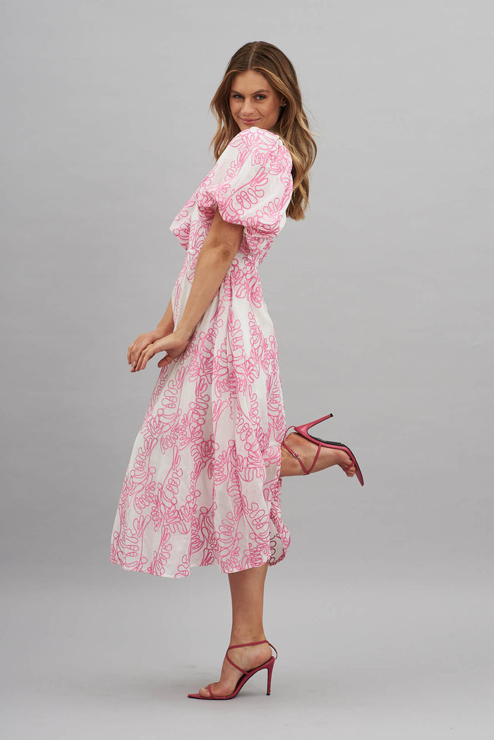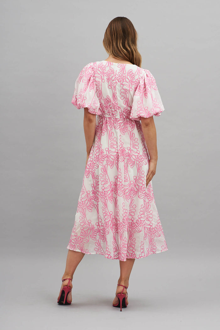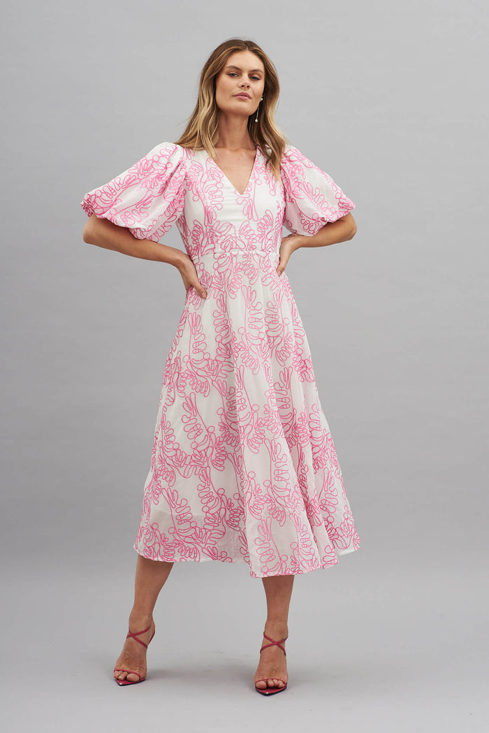 Introducing our Tiffany Maxi Dress. Featuring soft detailed embroidery all over, v-neckline, & figure flattering silhouette framed by voluminous puff sleeves. The perfect piece for dressy day to night occasions. Wear it with strappy heels & statement jewellery to complete the look.