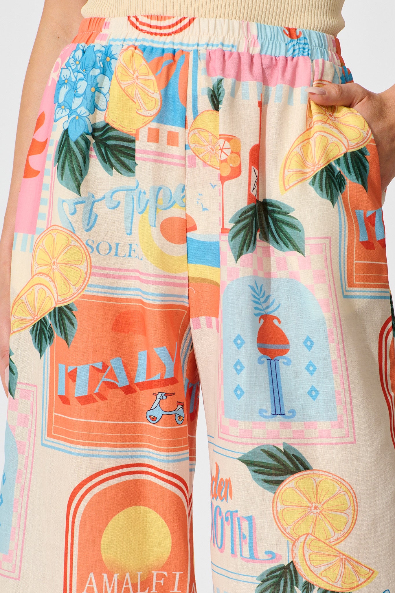 Crafted from lightweight, breathable fabric, these unlined pants feature an encased elasticised waist and functional side pockets for everyday practicality. The unique patchwork lemon print brings summer energy to any look, and no two pieces are exactly alike.