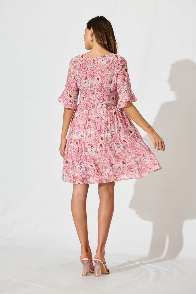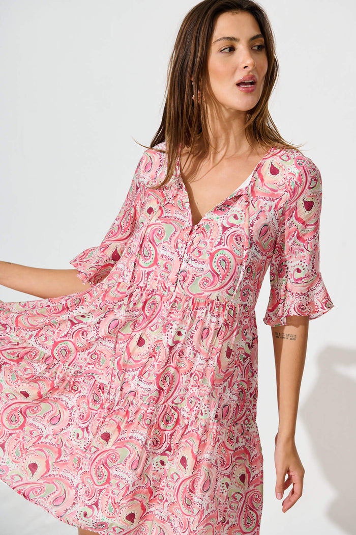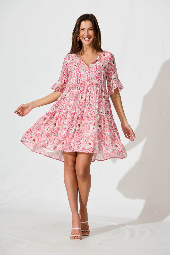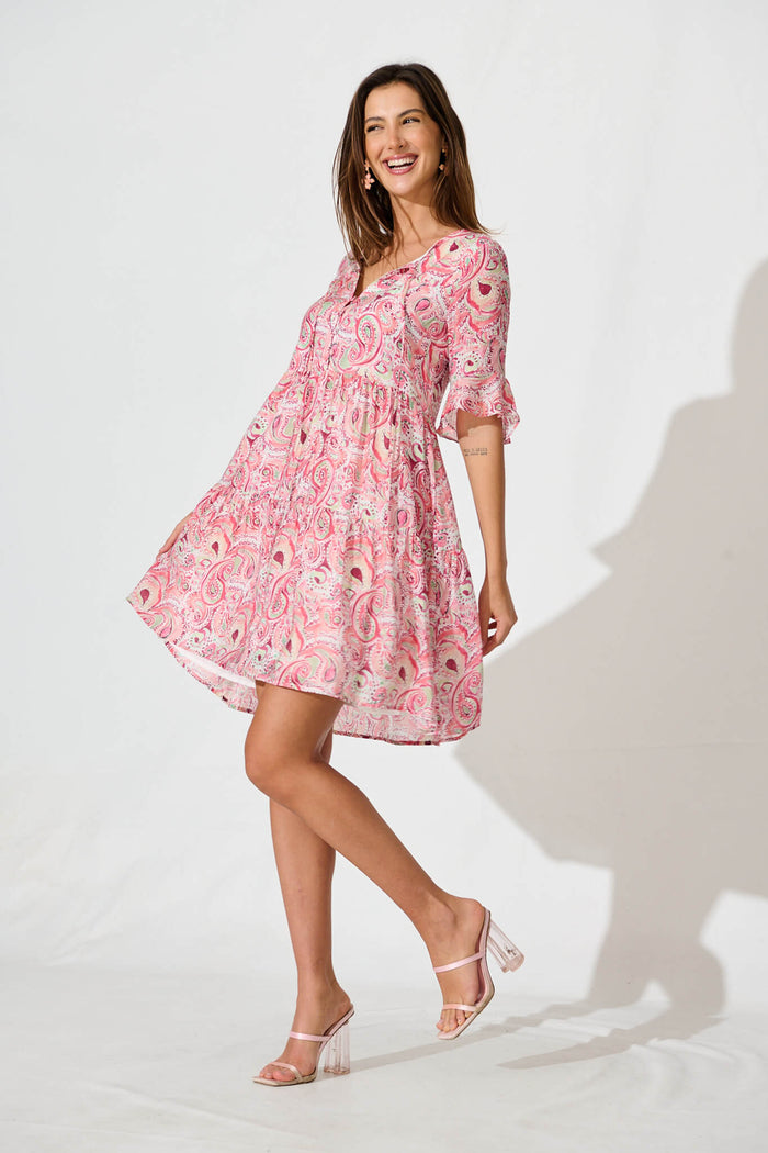Torance Smock Dress In Pink With Multi Paisley