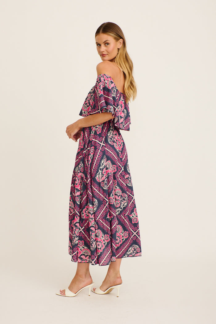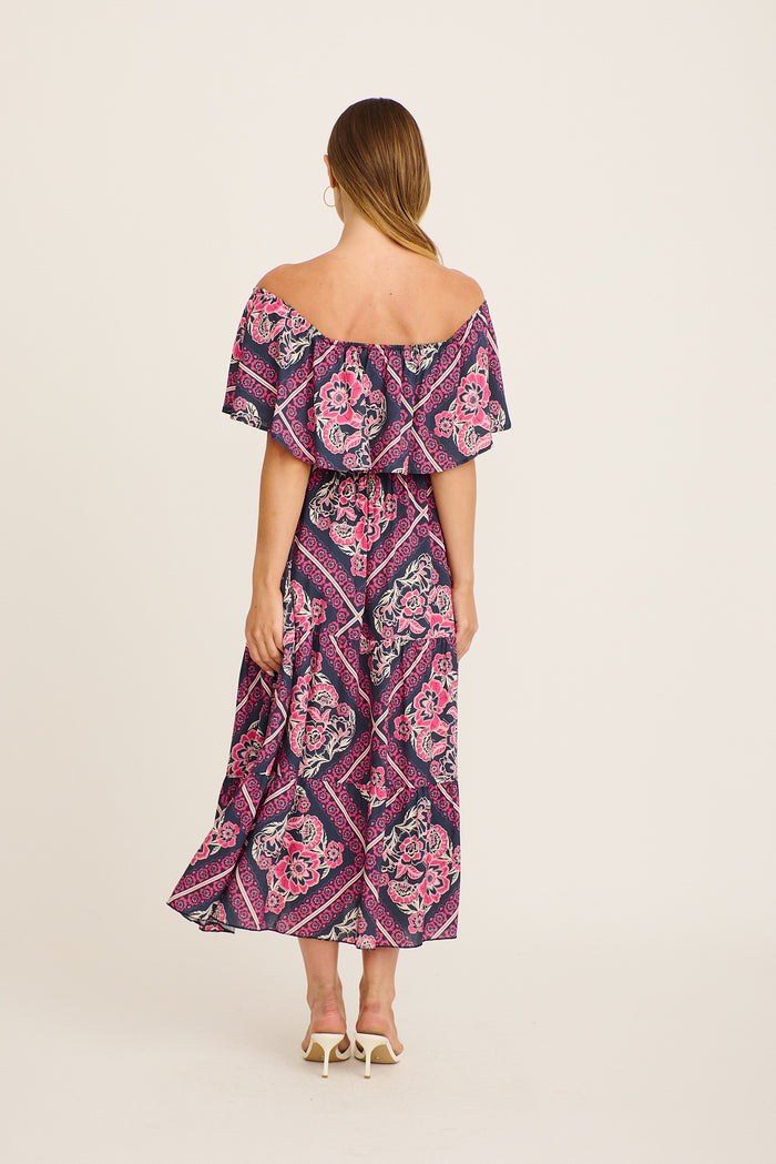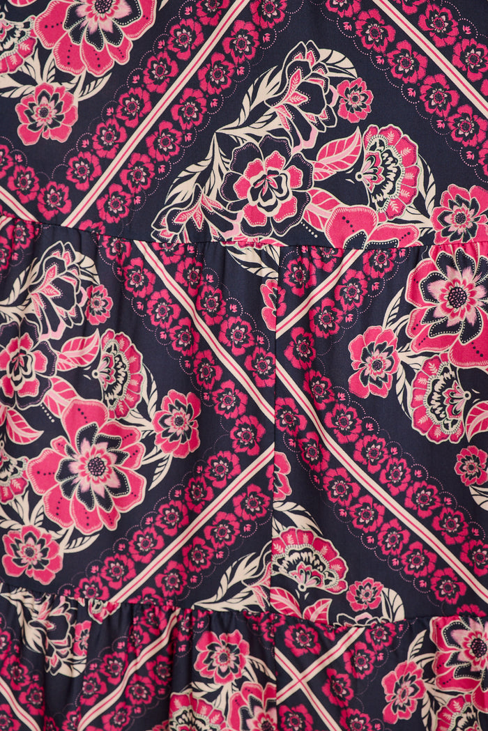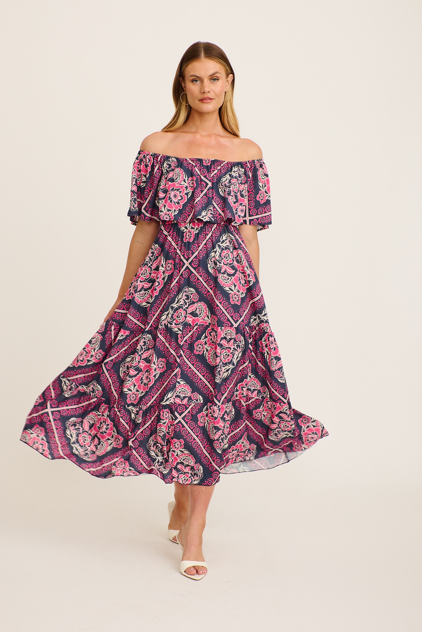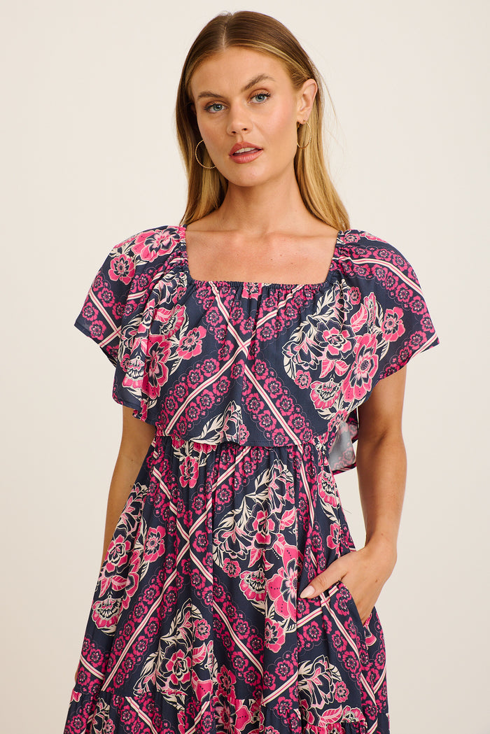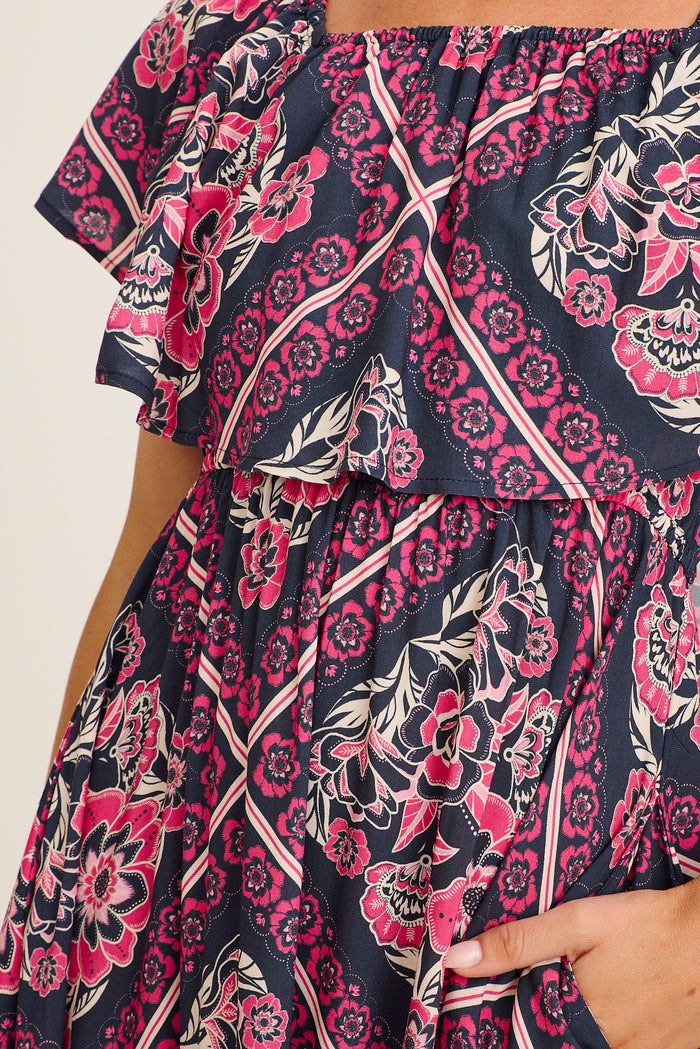 Tranquility Maxi Dress in Navy with Pink Floral Tiles Print