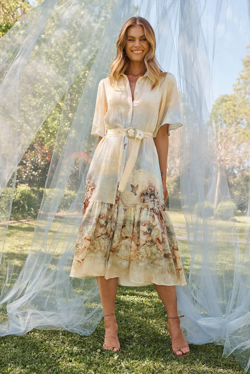 Indulge in heavenly fashion with our Vance Maxi Shirt Dress. Made from delicate crinkle fabric adorned with charming goddess angels in soft pastel hues. Complete with a matching belt and practical pockets, this dress is a beauty to behold.