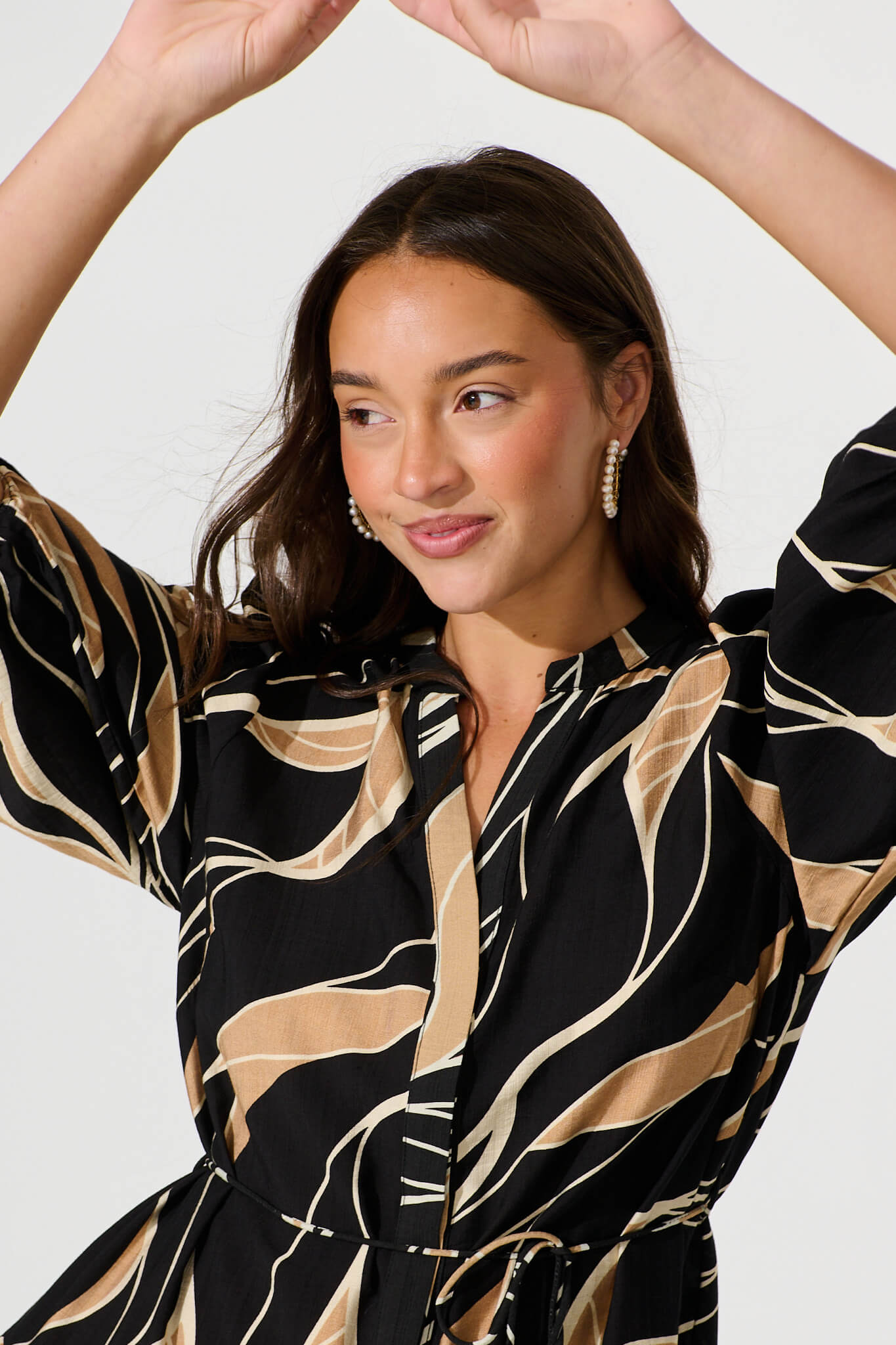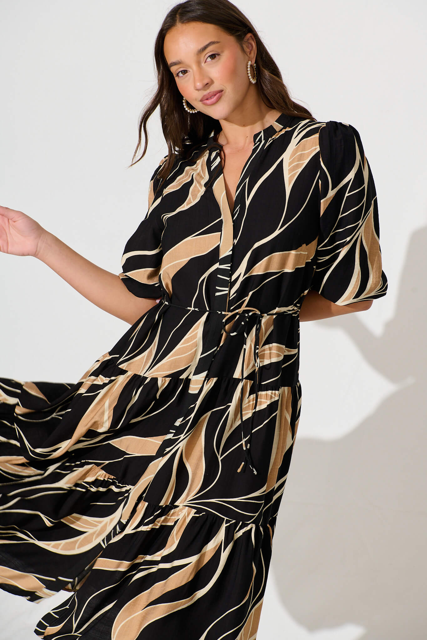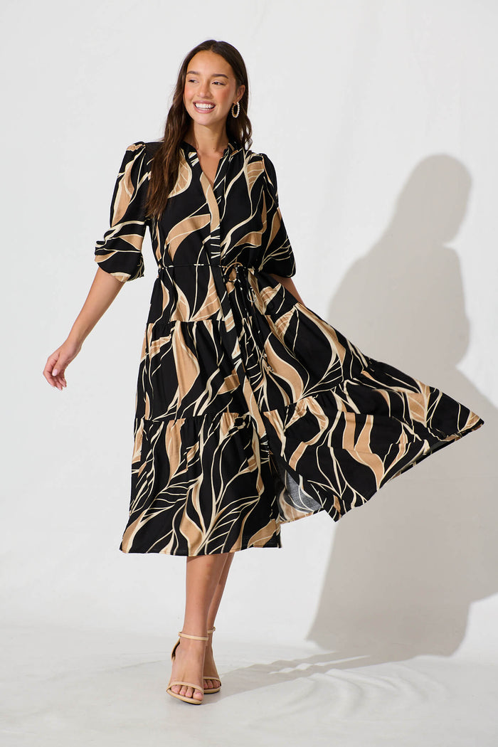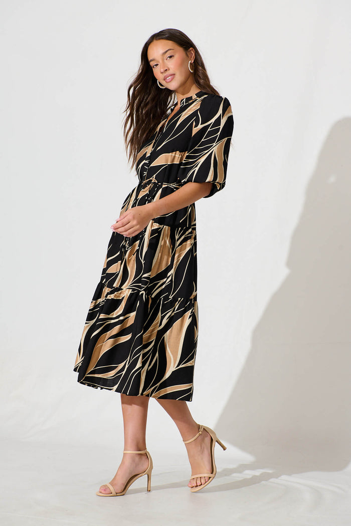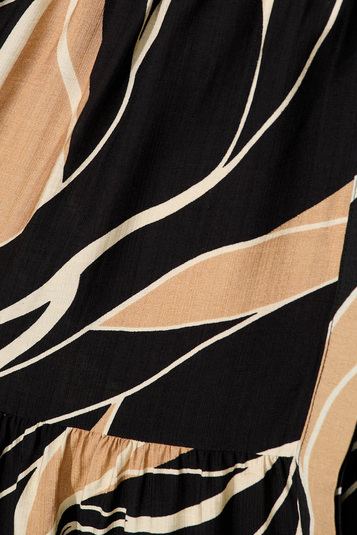 Vinnie Midi Dress In Black And Beige Leaf Cotton Blend