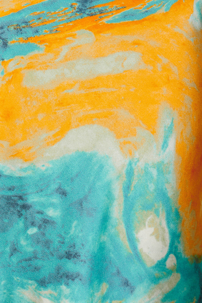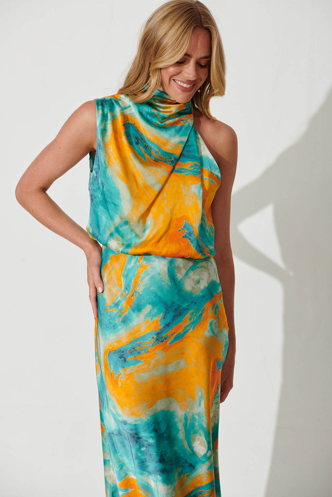 Visions Maxi Dress In Aqua With Orange Watercolour Satin