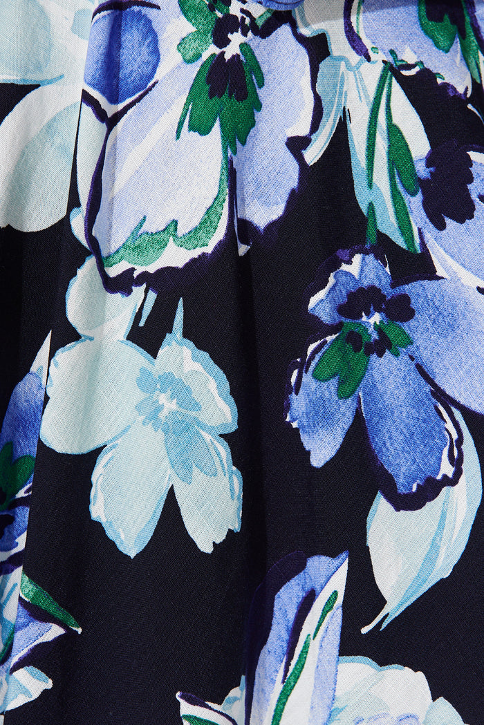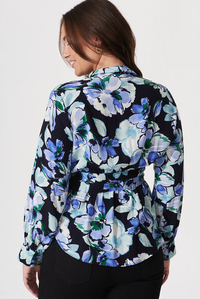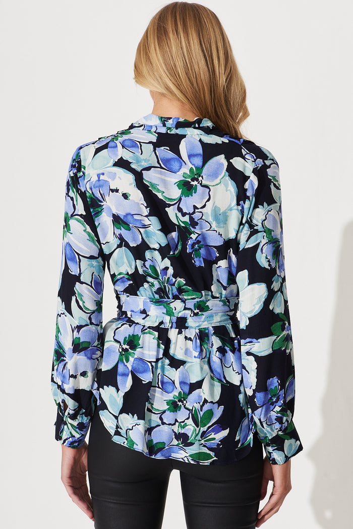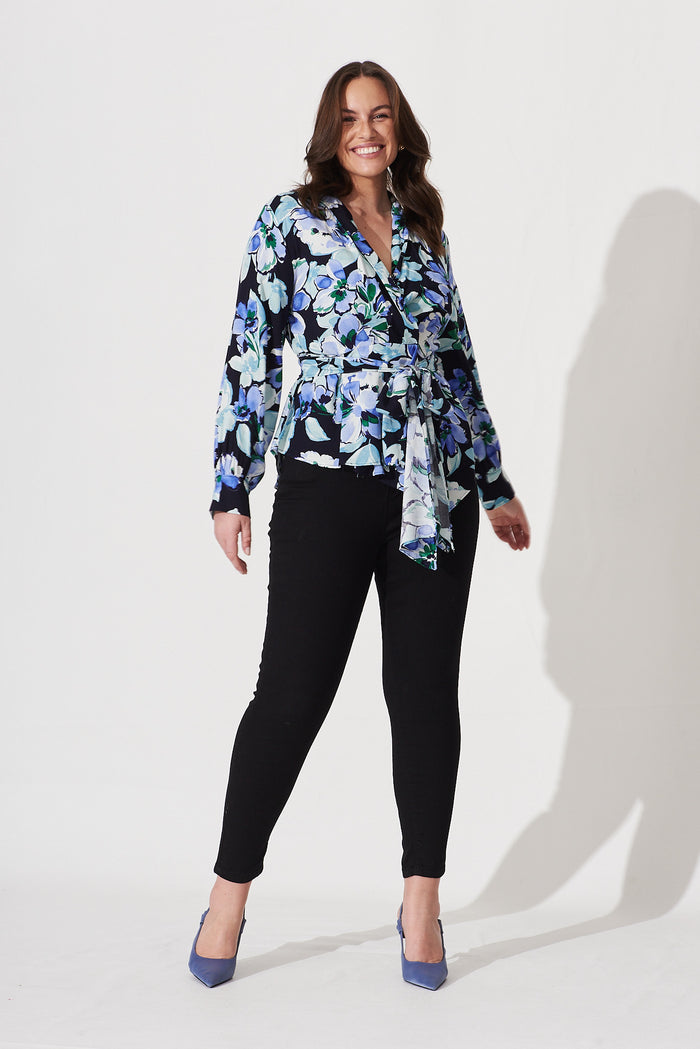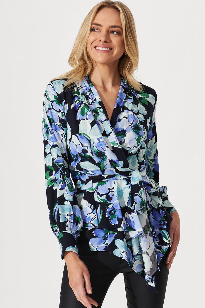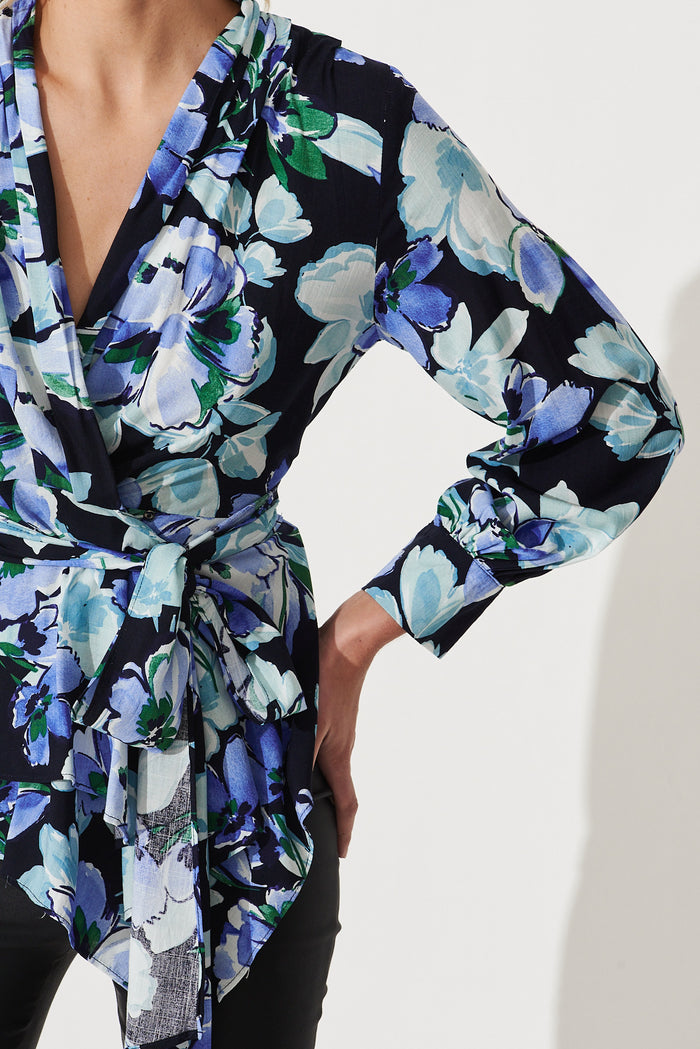Wanda Wrap Top In Black With Multi Blue Floral Print