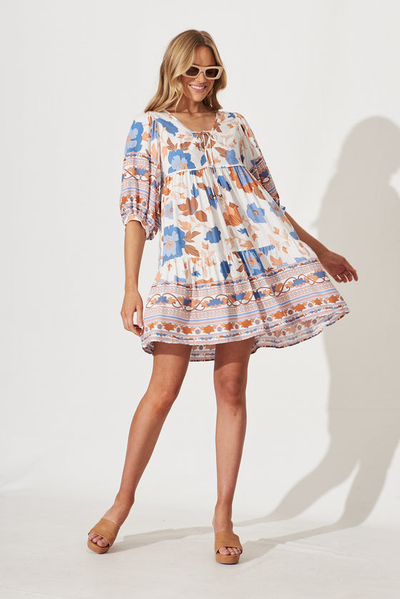 Wednesday Smock Dress In White With Rust Boho Floral