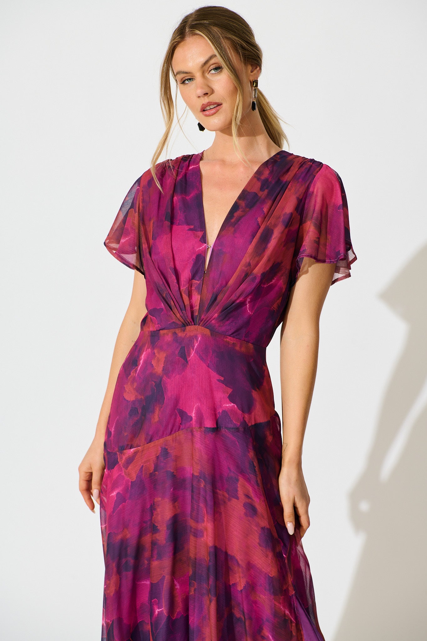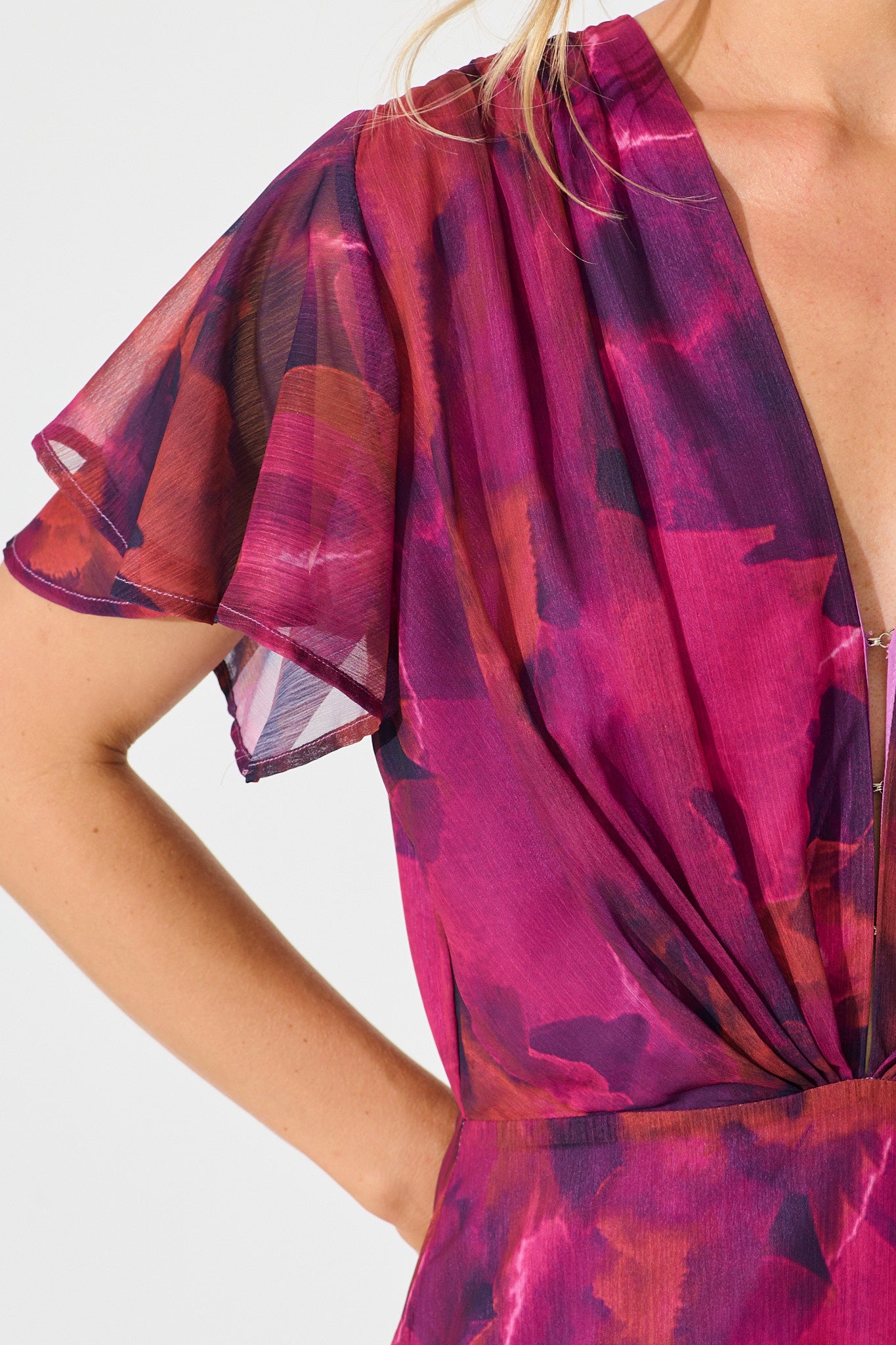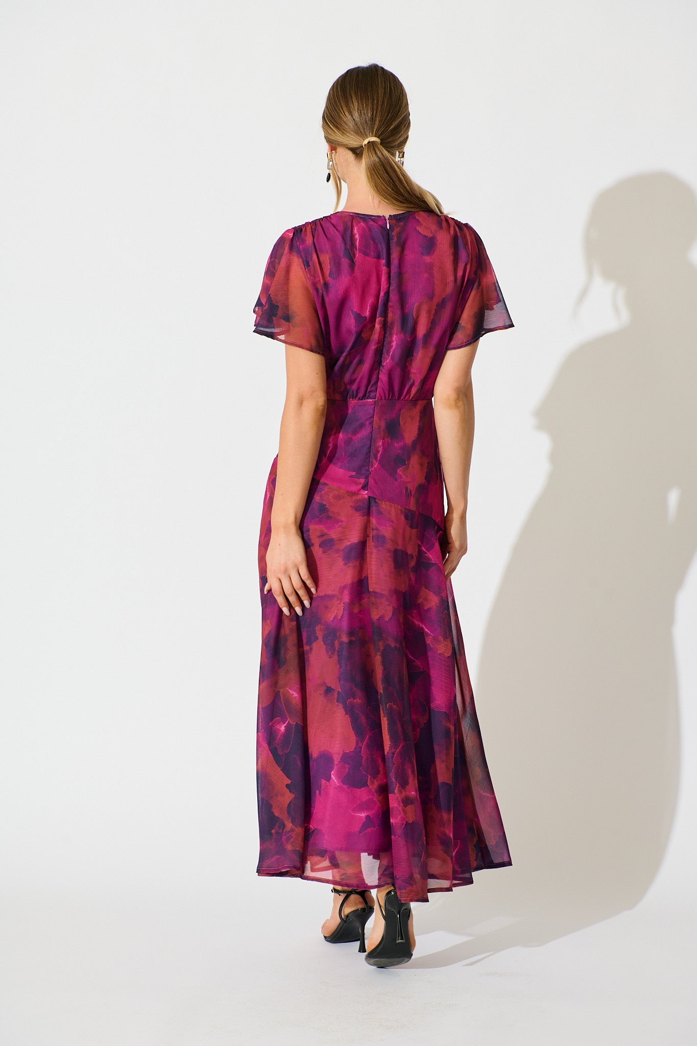 Crafted in lightweight chiffon, it features a fixed waist, flutter sleeves and a soft watercolour print. Perfect for weddings, garden parties or evening occasions.