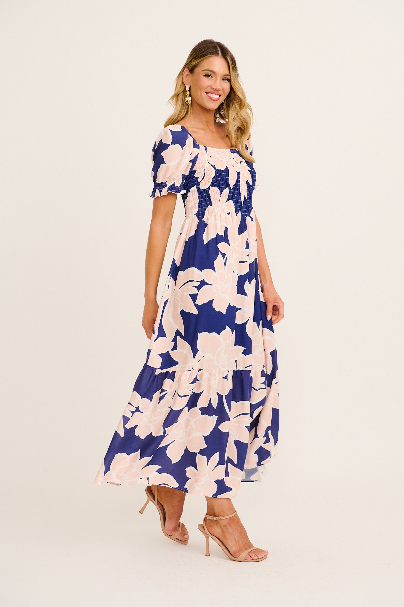 The Whisper Maxi Dress in Navy with Pink Floral is a romantic wardrobe addition designed to turn heads while keeping you comfortable. With its elegant silhouette and soft floral print, it's perfect for brunches, garden gatherings, or casual date nights.