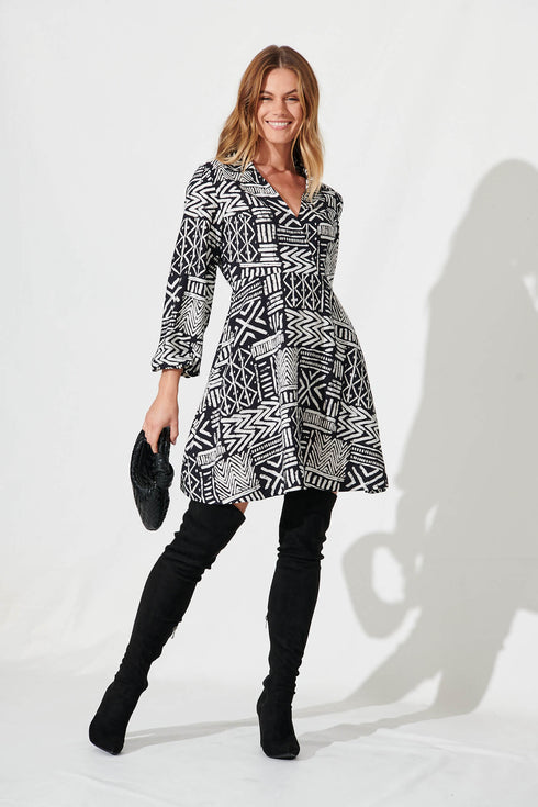 Wilma Dress In Black And White Geometric Print Cotton Blend