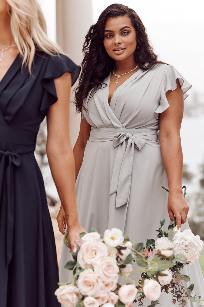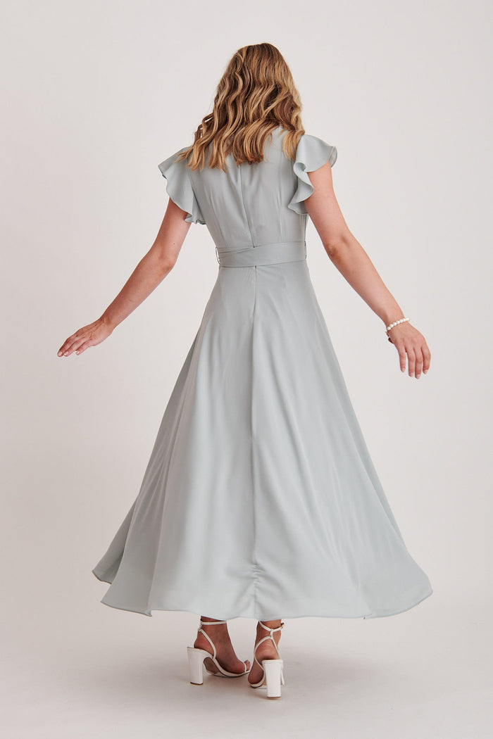 A beautifully pleated cross-over V-neckline frames your décolletage, while flutter sleeves and a softly cinched, fixed waist flatter every silhouette. The detachable waist tie lets you adjust the fit, while the flowy skirt with a gentle split gives you room to move (and a little drama with every step).