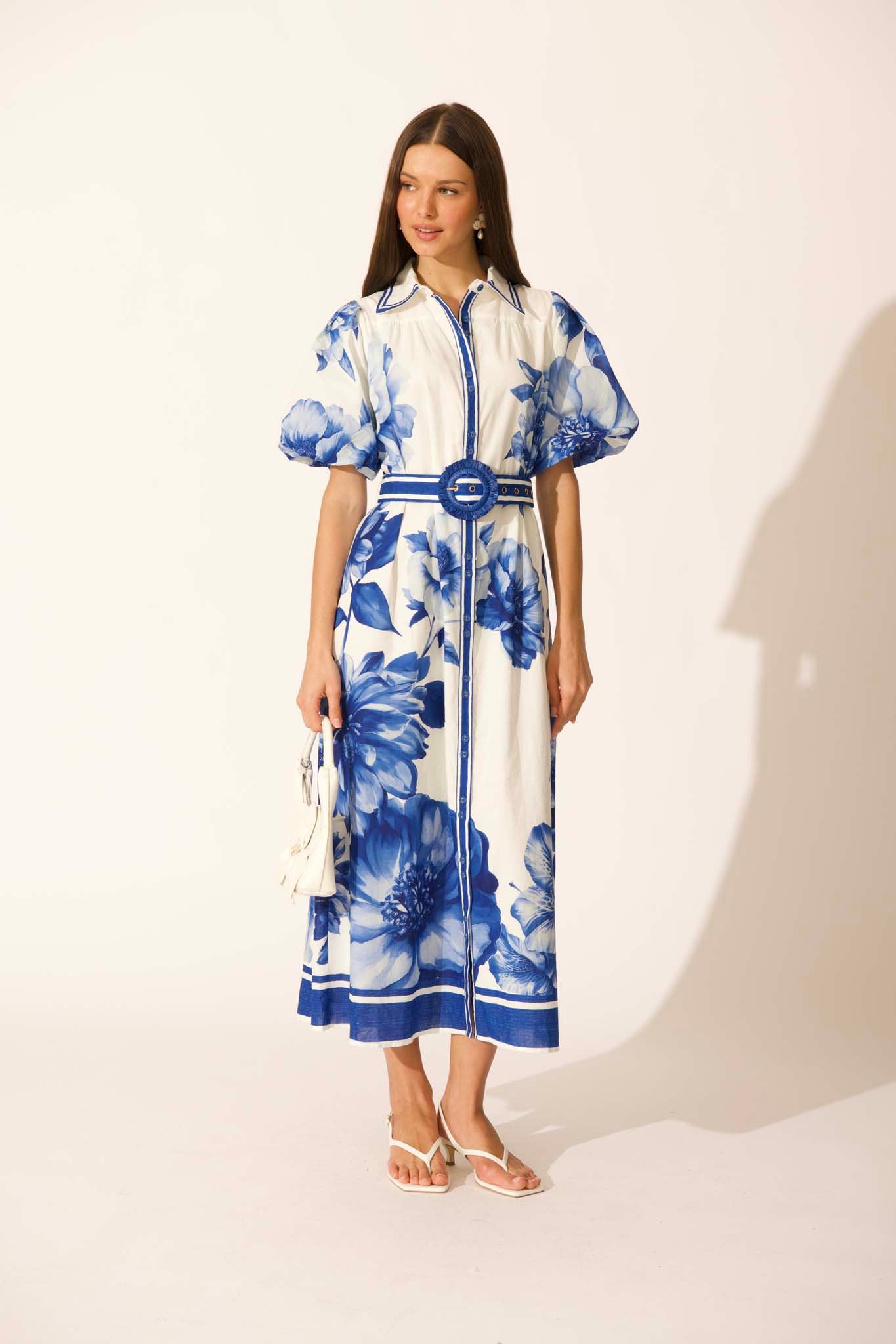 Zaraya Maxi Shirt Dress in Blue Floral Border Print Cotton