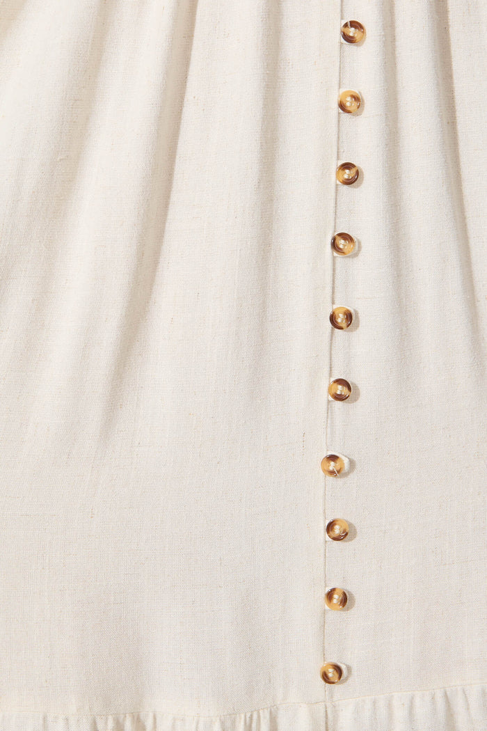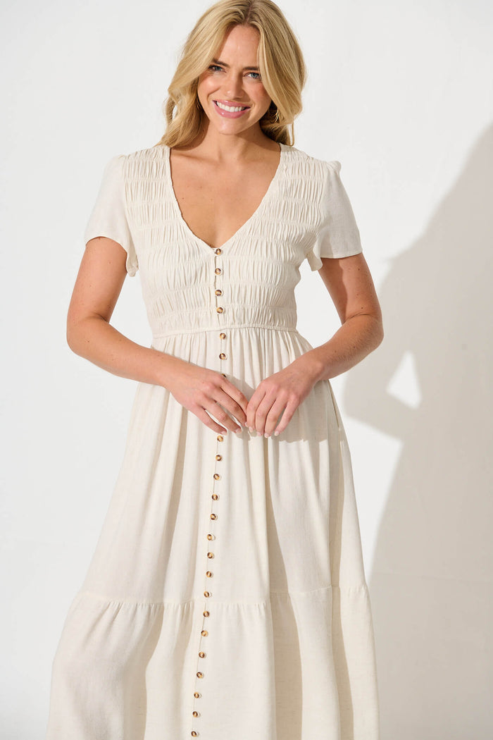 Introducing our Zenith Midi Dress, your new go-to piece for effortless style and comfort. This enchanting dress features a beautifully shirred bodice that hugs your figure in all the right places, complemented by a flattering front and back V-neck design. The delicate flutter sleeves add a feminine touch, making it perfect for any occasion.