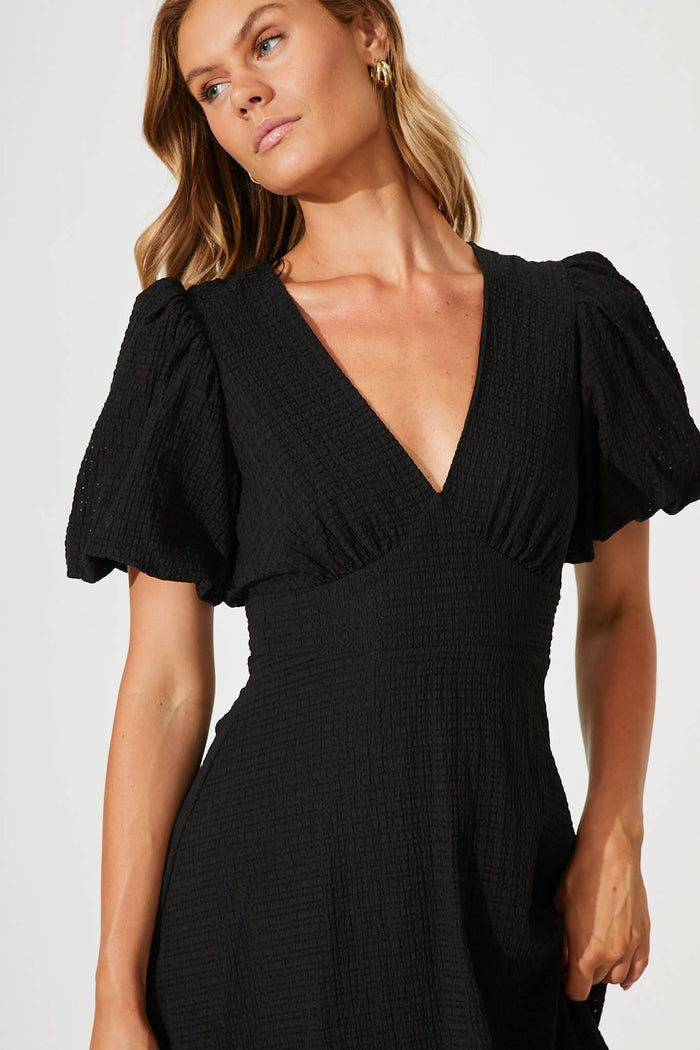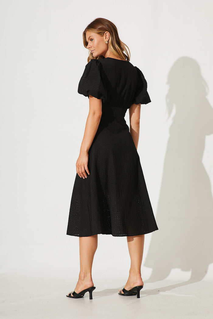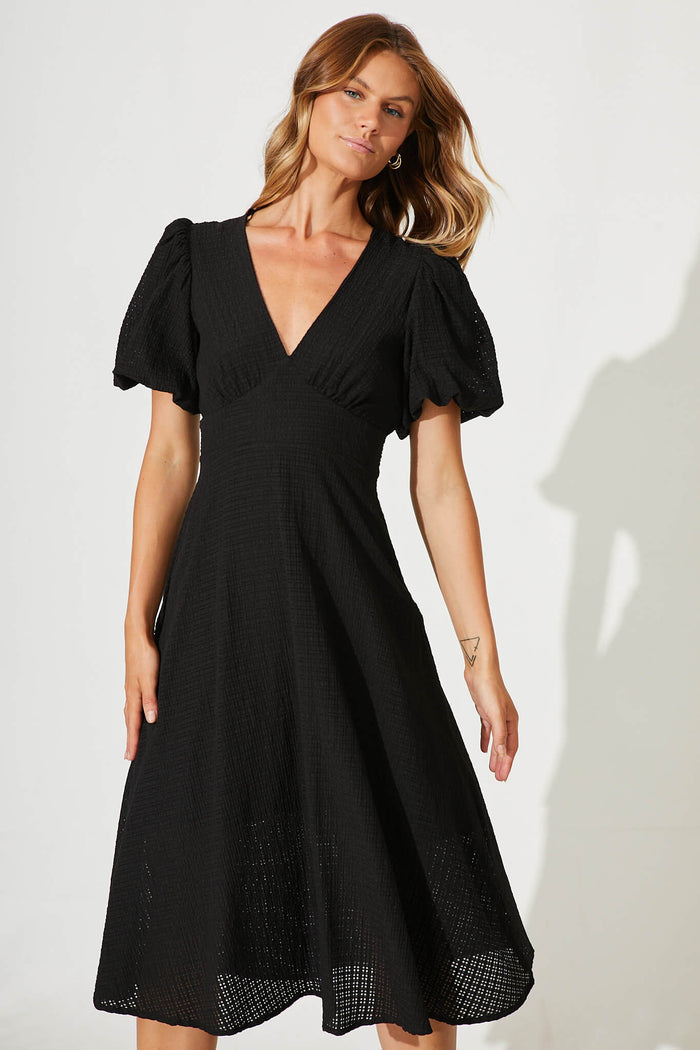 Zeta Midi Dress In Black Textured Organza Cotton Blend