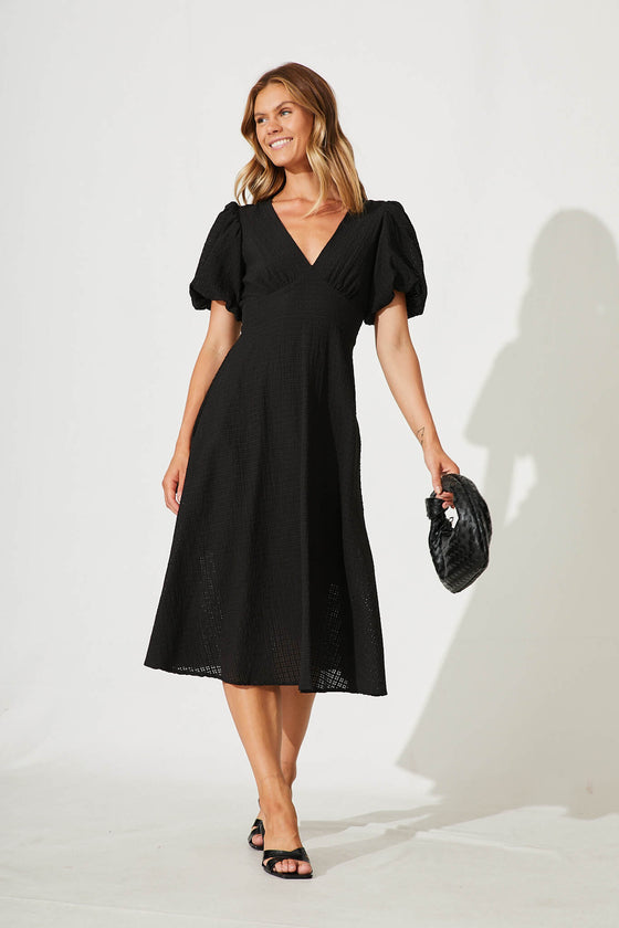 Zeta Midi Dress In Black Textured Organza Cotton Blend