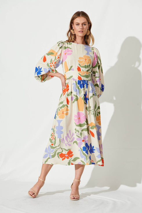 Zoe Midi Dress In Beige With Multi Floral Linen Blend